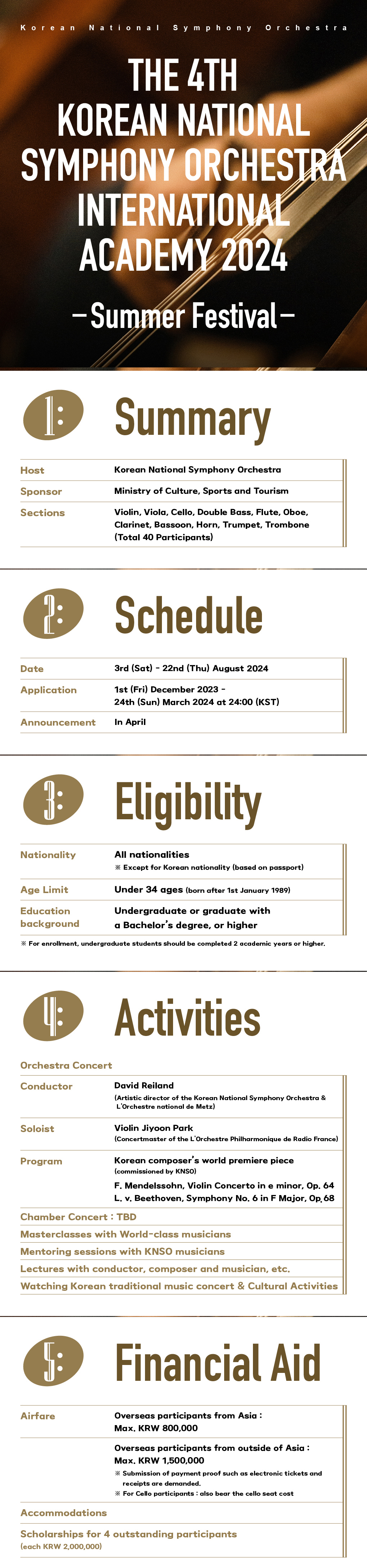 Notice Writer 운영자2023-11-30 2024 <KNSO Academy> Notice for International Participants views1428 Attachment 2024 KNSO Academy_Introduction.pdf Download 2024 KNSO Academy_Audition Repertoire.zip Download 2024 KNSO Academy_Video Guideline.pdf Download Previous KNSO 2023 Season Next KNSO Season 2024 List