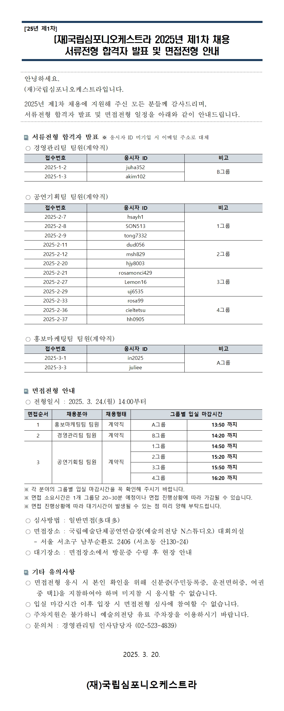 공지사항 작성 운영자2025-03-20 (재)국립심포니오케스트라 2025년 제1차 채용 서류전형 합격자 발표 및 면접전형 안내 조회1484 첨부파일 이전 (재)국립심포니오케스트라 2025년 제1차 채용 서류접수 현황 발표 다음 2025 KNSO Academy (청년 교육단원) - 연주자 과정 추가 모집 관련 실기 심사 세부 안내 목록