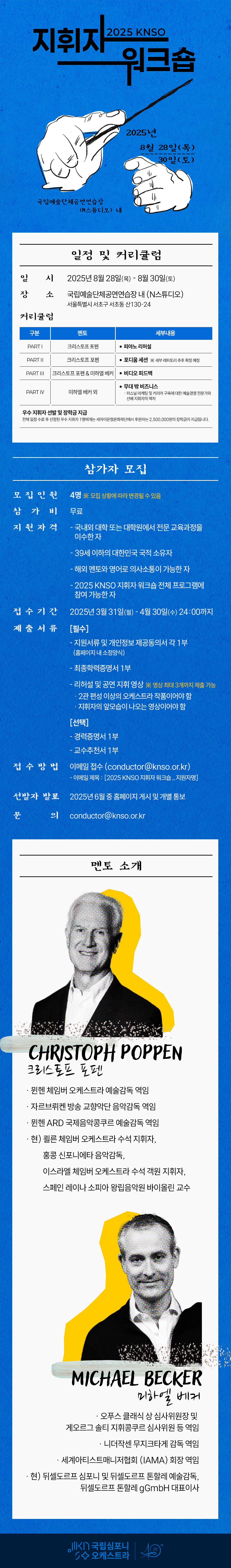 공지사항 작성 운영자2025-03-28 2025 KNSO 지휘자 워크숍 참가자 모집 공고 조회1404 첨부파일 2025 KNSO 지휘자 워크숍_지원서류 및 개인정보 제공동의서.hwp 다운로드 이전 2025 KNSO Academy (청년 교육단원) - 연주자 과정 추가 모집 최종 합격자 발표 안내 다음 2025 KNSO Academy (청년 교육단원) - 평론 과정 추가 모집 관련 면접 심사 세부 안내 목록