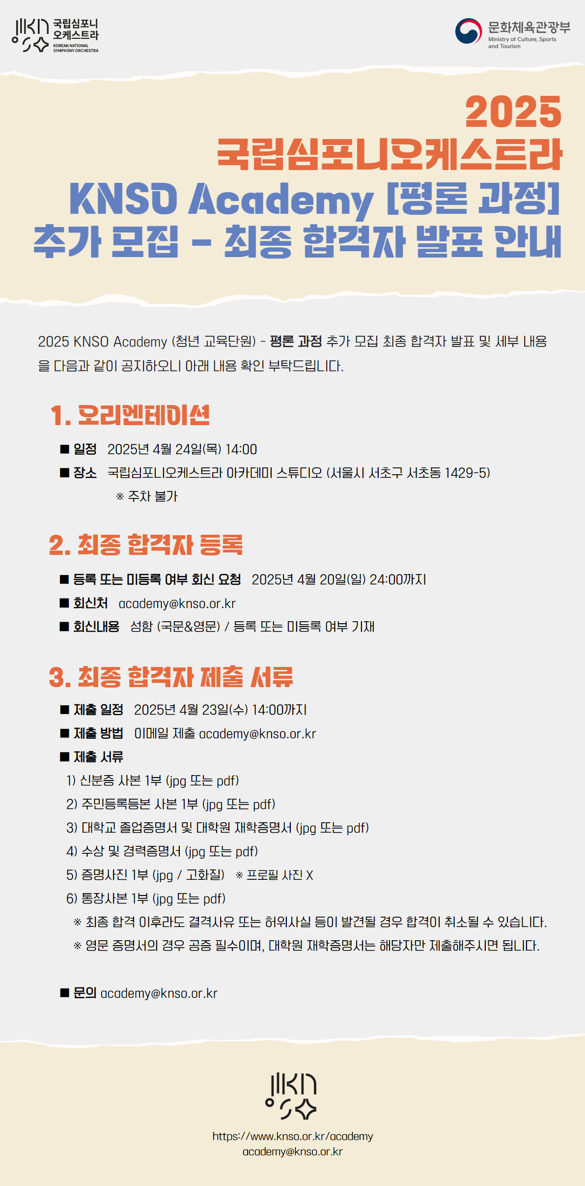 공지사항 작성 운영자2025-04-17 2025 KNSO Academy (청년 교육단원) - 평론 과정 추가 모집 최종 합격자 발표 안내 조회1518 첨부파일 이전 제 8대 음악감독 로베르토 아바도(Roberto Abbado) 선임 안내 다음 2025 국립심포니오케스트라 사회공헌 음악회 ‘동행’ 참여단체 모집공고 목록