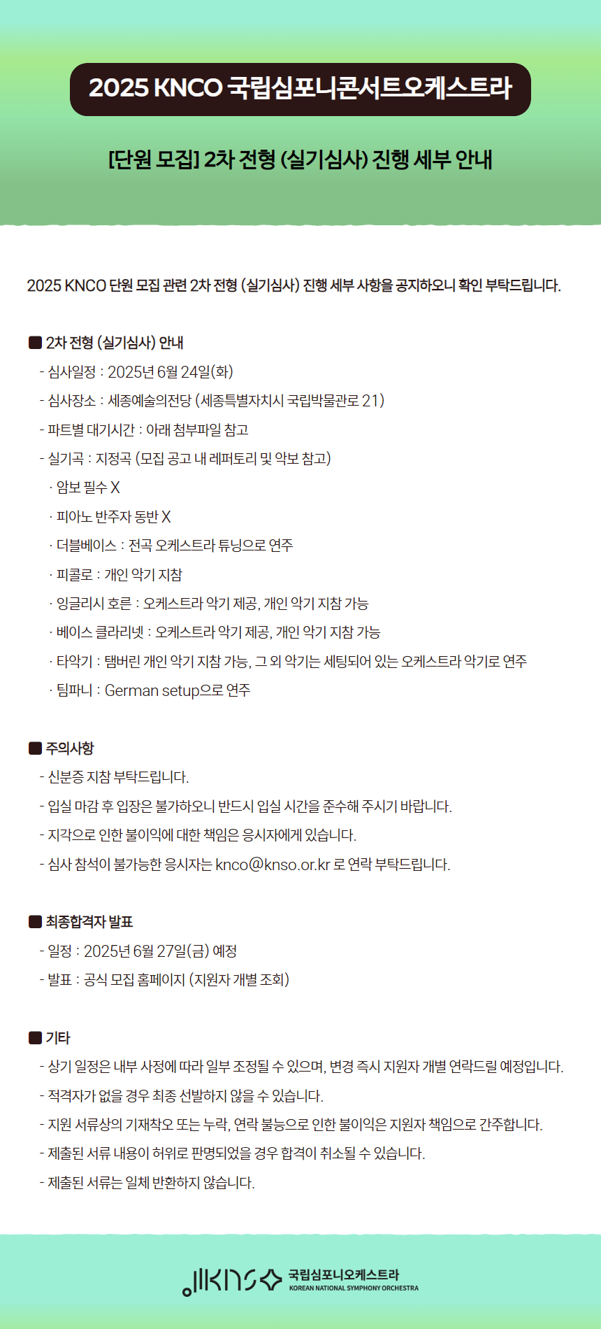 2025 KNCO 국립심포니콘서트오케스트라 - 단원 모집 2차 전형 (실기심사) 세부 안내