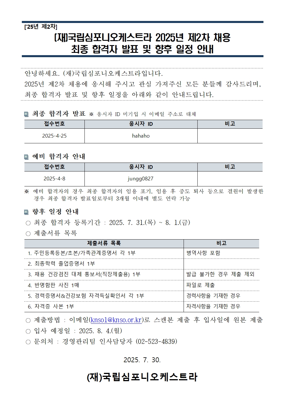 공지사항 작성 운영자2025-07-30 (재)국립심포니오케스트라 2025년 제2차 채용 최종 합격자 발표 및 향후 일정 안내 조회2145 첨부파일 이전 (재)국립심포니오케스트라 2025년 제2차 채용 서류전형 합격자 발표 및 면접전형 안내 다음 2025 KNSO 지휘자 워크숍 '포디움 세션' 마스터클래스 청강생 모집 목록