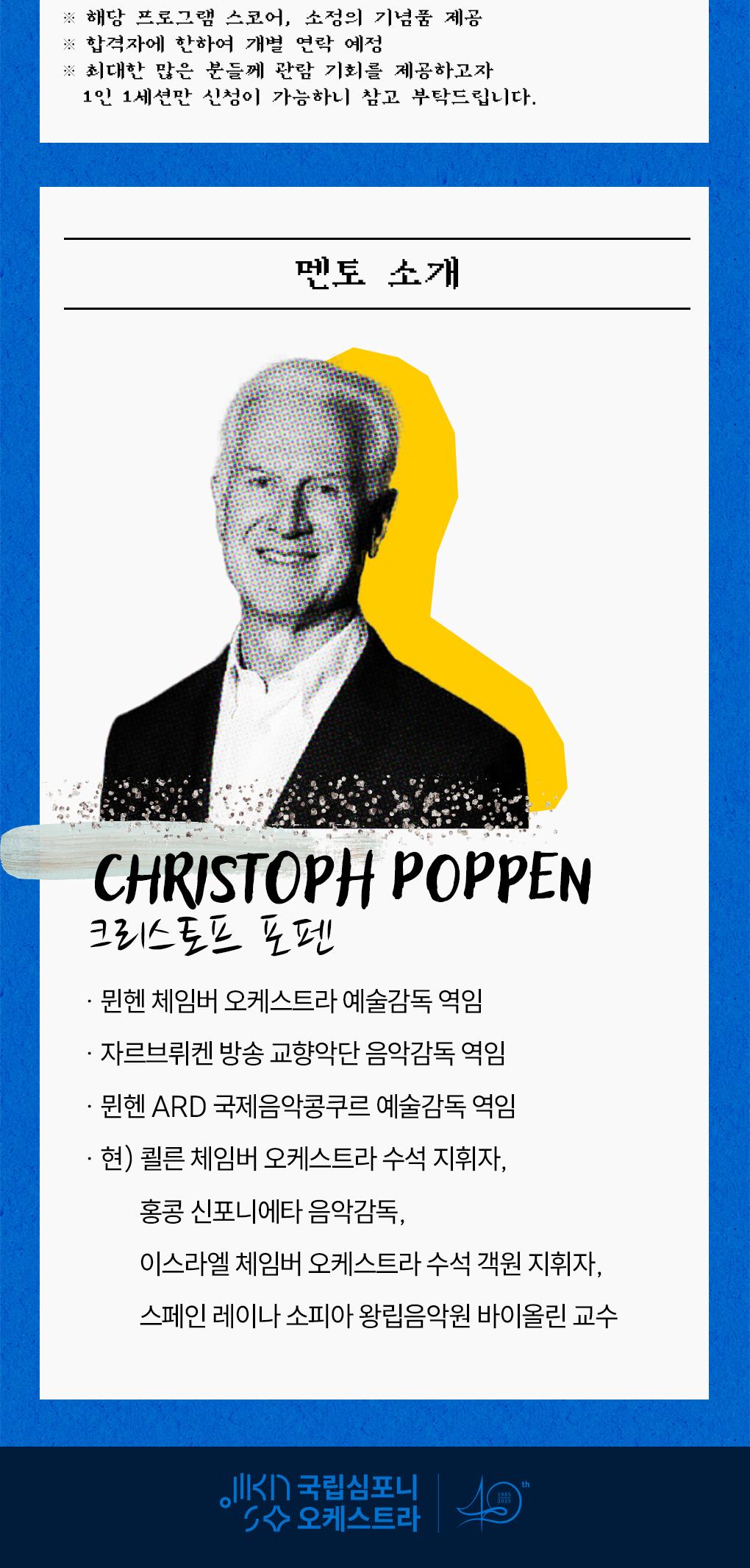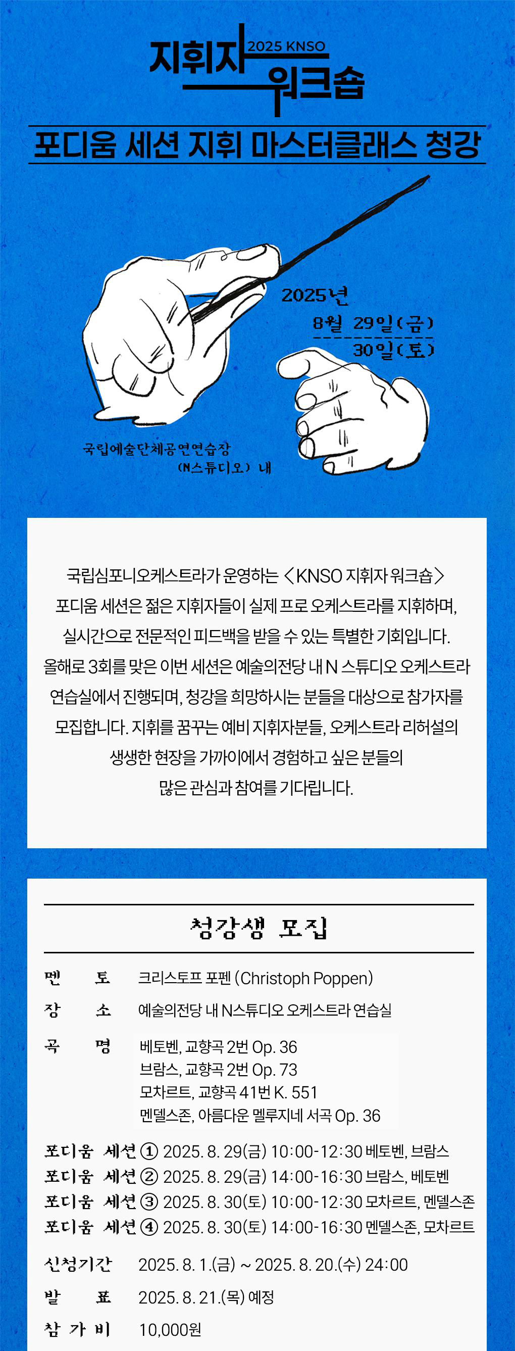 공지사항 작성 관리자2025-07-30 2025 KNSO 지휘자 워크숍 '포디움 세션' 마스터클래스 청강생 모집 조회1336 첨부파일 이전 (재)국립심포니오케스트라 2025년 제2차 채용 최종 합격자 발표 및 향후 일정 안내 다음 오디션일정 공고 목록